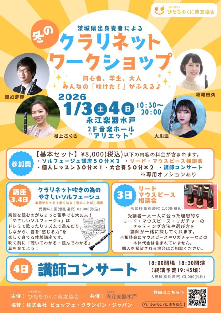 【冬のクラリネットワークショップ】開催 茨城県出身奏者による『冬のクラリネットワークショップ』開催!初心者、学生、大人、みんなの「吹けた!」がふえる♪ 全日程参加の【基本セット】選んで参加ができる【個別選択】が選べます♪ 多くの皆様のご参加をお待ちしております。 詳細はこちらへ
